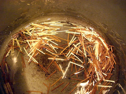 In the saucepan, heat the oil over medium-high heat. In the meantime, put the rice in a colander and run it under cool tap water to rinse, set aside to drain. Break the pasta noodles into pieces that are about 1/2-inch long and add them to the oil. Keep an eye on them because they will brown VERY quickly, once they do, add the rice. Stir it several times to coat all the grains evenly.