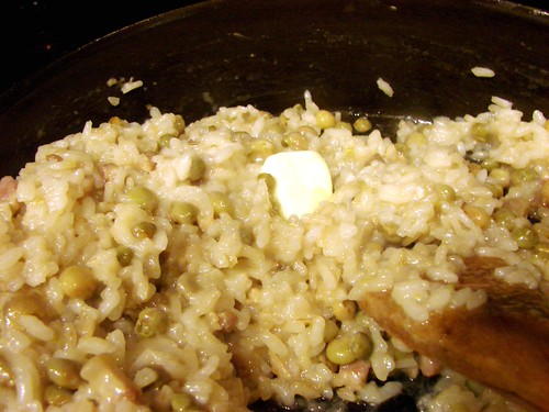 Once the liquid is almost completely evaporated, bring the temperature to low and cover with the lid. Allow to steam undisturbed for 40 minutes. When you remove the lid, all the peas will be at the top, go ahead and stir them into the rice. You’re done!