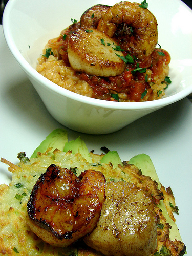 Reduce the temperature to low. More than likely, the liquid will be almost completely gone by now, this is when you layer the shrimp and scallops over the top.