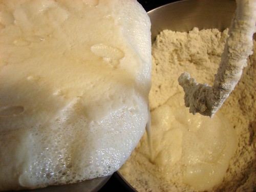 Mix in the egg, then add the sponge and continue mixing for about 3 minutes to develop the gluten.